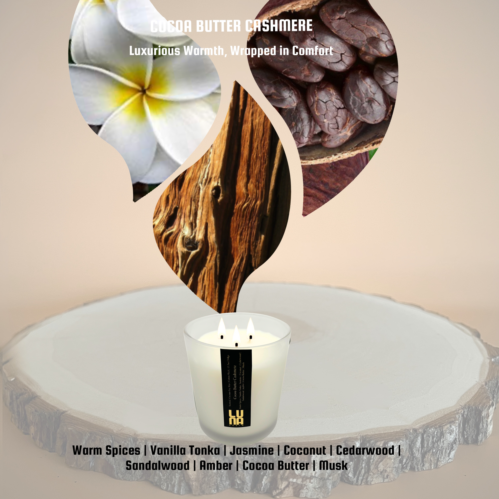 Base Notes: Smooth cedarwood, warm sandalwood, luxurious amber, velvety cocoa butter, and soft musk, leaving an indulgent and grounding finish.